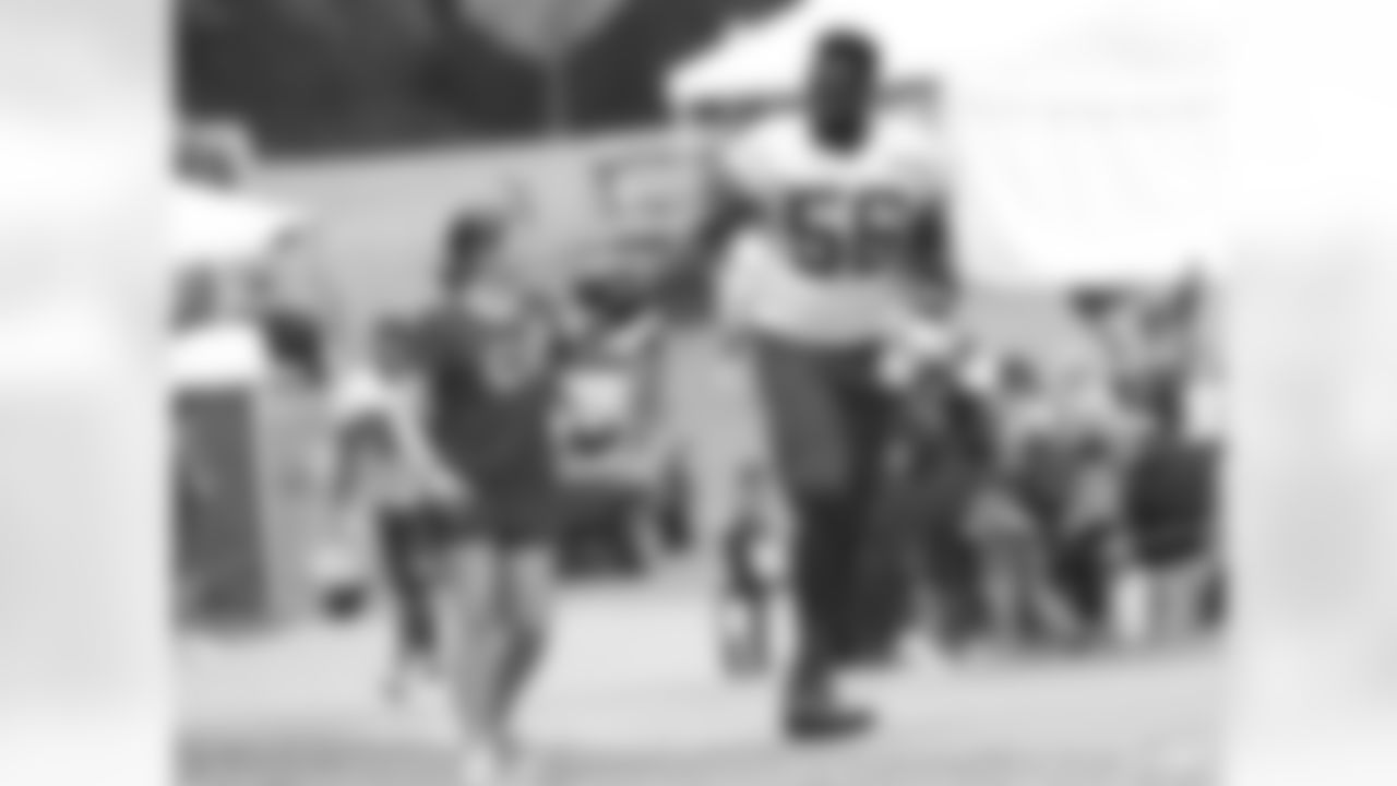 Kansas City Chiefs linebacker D.J. Alexander (57) walks with a young fan up the hill after practice on the fifth day of training camp on Mosaic Life Care Field at the campus of Missouri Western State University on Wednesday, August 3, 2016.