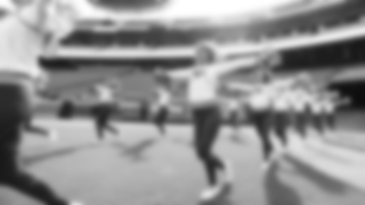 Kansas City Chiefs Cheerleaders with Dante Hall on the GEHA Deck during the week 7 NFL football game against the Los Angeles Chargers on Sunday, October 22, 2023 at GEHA Field at Arrowhead Stadium.