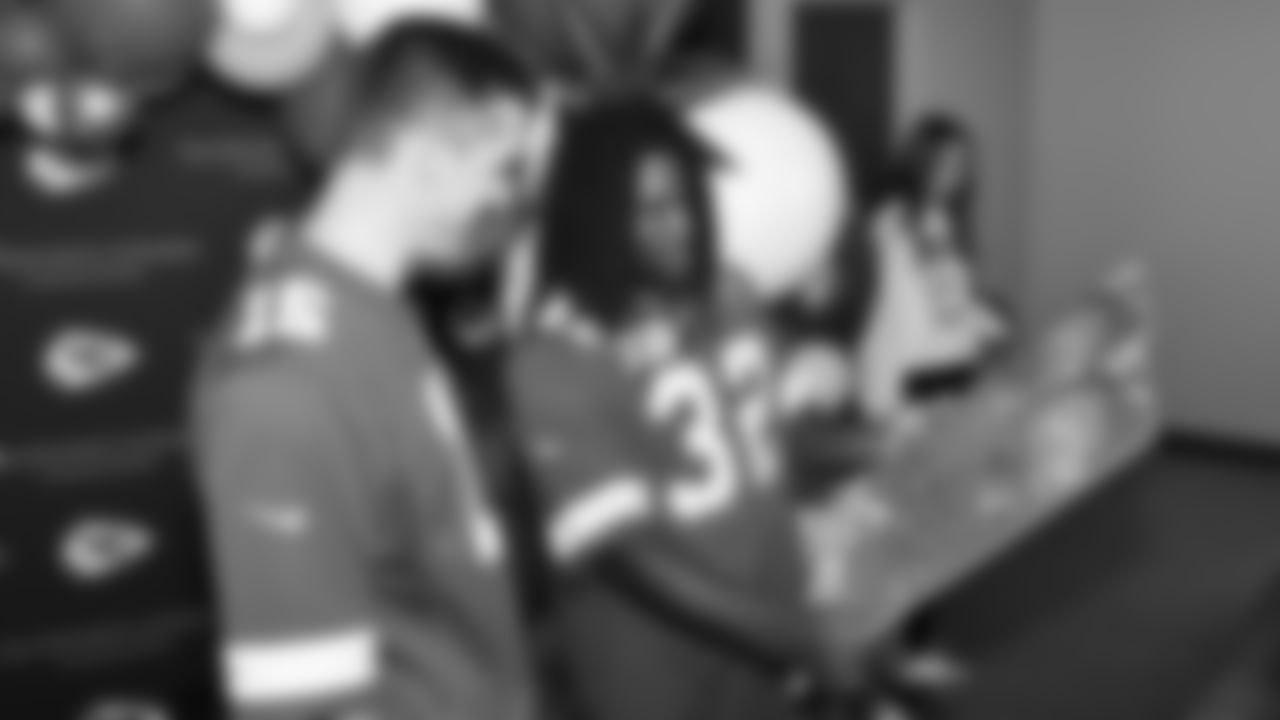Austin Hill and Kansas City Chiefs linebacker Nick Bolton (32) at The University of Kansas Health System Infusion Center on Tuesday, October 3, 2023 in Kansas City, MO.