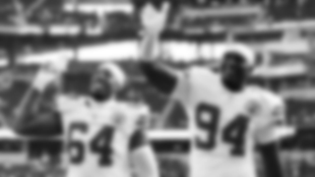 Kansas City Chiefs defensive end Malik Herring (94) and offensive tackle Wanya Morris (64) wave to the crowd following the NFL Week 4 matchup between the Kansas City Chiefs and the Los Angeles Chargers on Sunday, September 29, 2024 in Los Angeles.